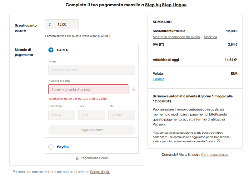 Importante: il tuo account Patreon, i tuoi dati e le tue transazioni non sono gestiti da Step by Step Lingue ma dalla piattaforma Patreon stessa.